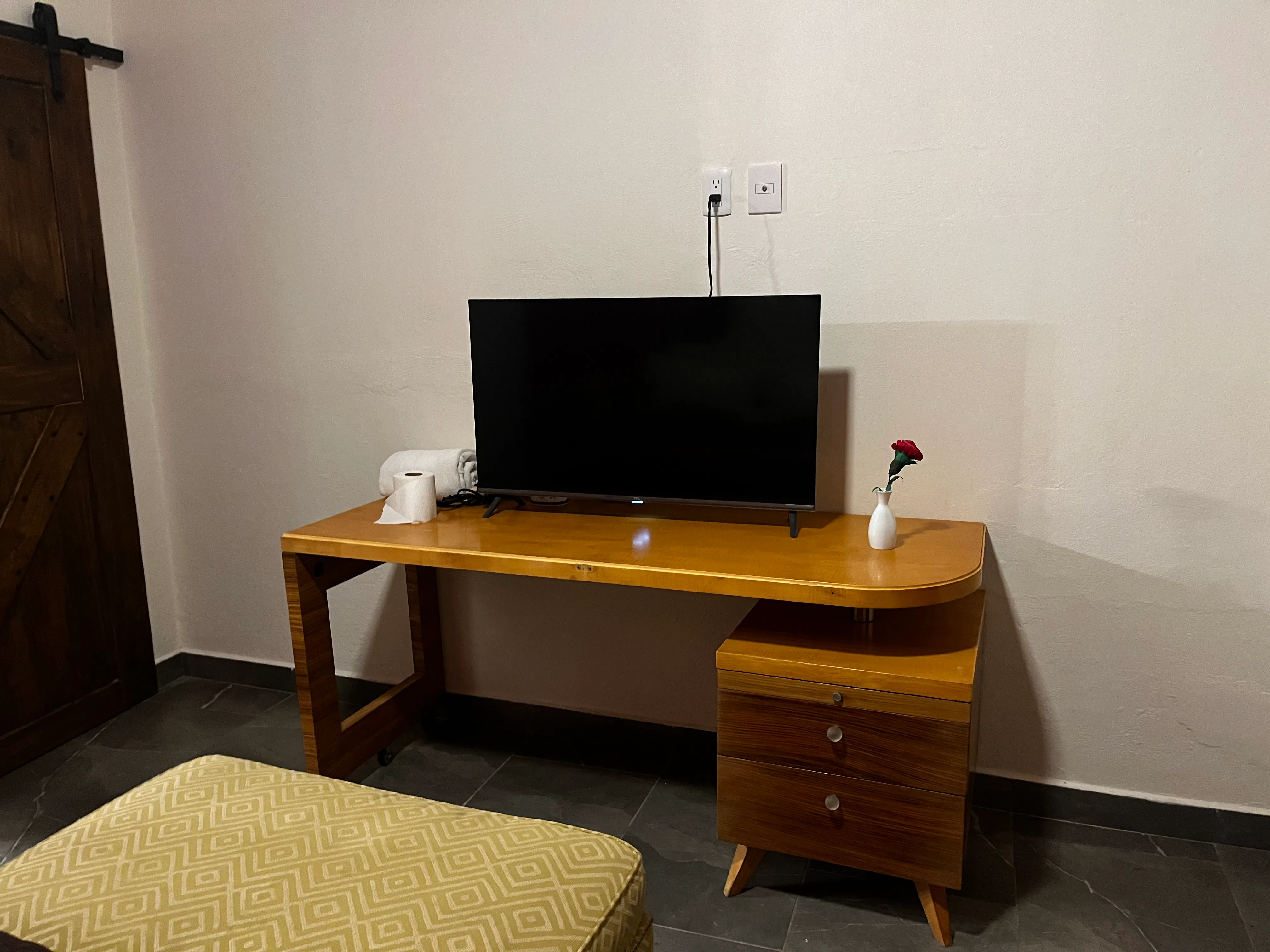 Relájate en nuestra cómoda habitación para dos personas, con cama queen, sala pequeña, cocina equipada y baño privado. Además, disfruta de pantalla plana, aire acondicionado, clóset, internet y frigobar para una estancia perfecta.